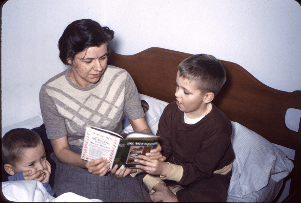 Bob, Mother, and Tom at bedtime c 1953